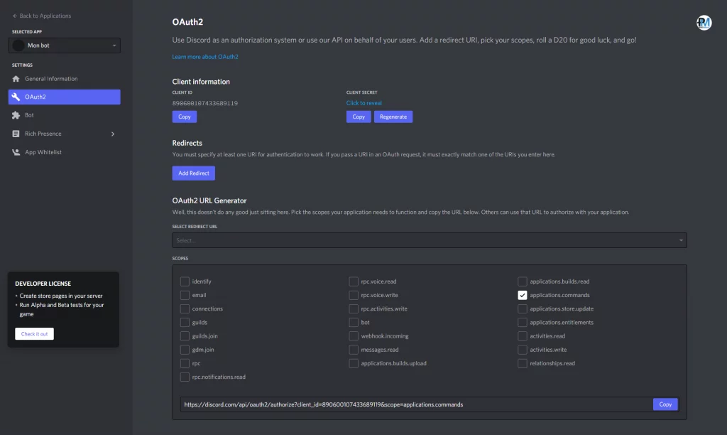 Maintenant il va falloir inviter votre bot sur l’un de vos serveurs ! Il faut aller sur la page OAuth2 et sélectionner le scope application.commands pour générer un lien d’invitation.
