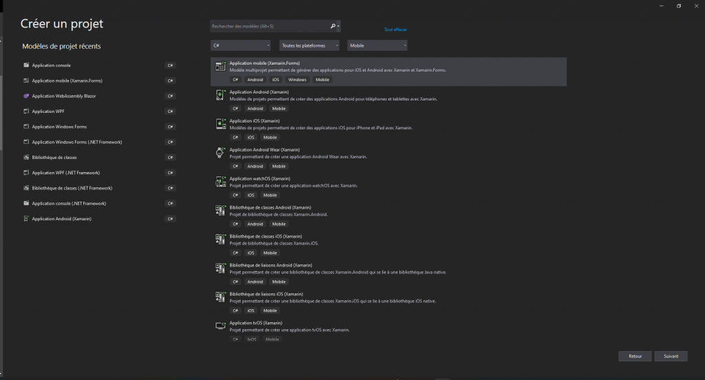 - Choisissez le type de projet Application mobile (Xamarin.Forms).
