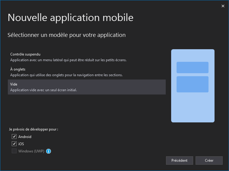 - Choisissez le type de projet Application mobile (Xamarin.Forms).